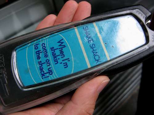 We were a day early for Shacktoberfest, so without the “special Shacktoberfest offerings” to distract, our choice was clear. We put in an order for a round of Shack burgers and fries and repaired to the picnic tables to wait. Last year, due to popular demand, the Shack installed a live ShackCam (rendering the ShackWatchers photo posting service obsolete) so that would-be visitors could monitor the order line and plan their food runs accordingly. This year, they introduced what has been dubbed the ShackWand, which buzzes to let you know when your order is ready for pick-up. Beats the old system of hovering by the window, straining to hear your number called out into the park.