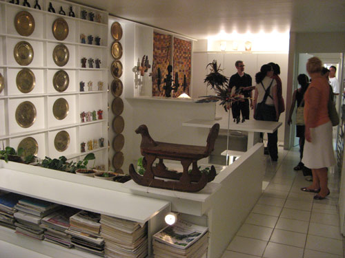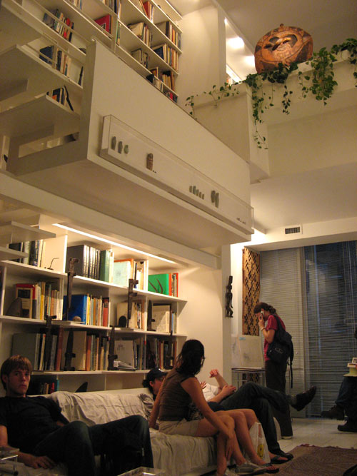I’ll leave the design commentary to the trained architects (at least one of whom I know reads this blog), and just relate my impressions. As soon as we stepped off the elevator, the sleek exterior revealed a complicated, multi-leveled interior. Dozens of OHNY visitors circulated up, down, around and through the puzzle box of a townhouse. Several just plopped themselves onto the built-in couches to take in the intricately interwoven space around them: all white and glassy, reflective surfaces, with bookcases, floating shelves and open staircases creating layers that combined into a series of unusually shaped compositions that belied the narrow confines of the 20-foot-wide building. The residential duplex was originally designed as two separate two-story apartments, front and rear; Wagner occupies both as a 2,700-square-foot merged unit. For all its complexity, though, I was happy to see that the space still functioned as a home rather than just a showroom; the kitchen had a less-than pristine patina, and we spied a cell phone charging in the bathroom.