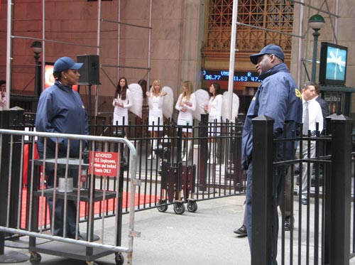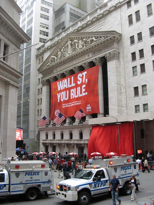 Strolling through the financial district this afternoon, I found Wall Street buzzing with even more activity than usual. Yesterday, the street was awash in Tiffany blue. Today, we saw this giant red banner draped over the pillars of the New York Stock Exchange — I can’t resist these ads! — and the street in front lined with regal red carpet leading up to a giant LCD screen, broadcasting Virgin Mobile promos on continuous loop.