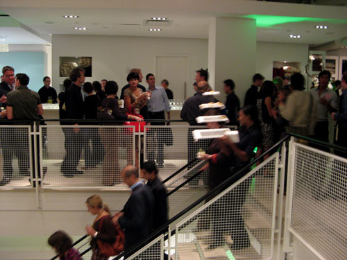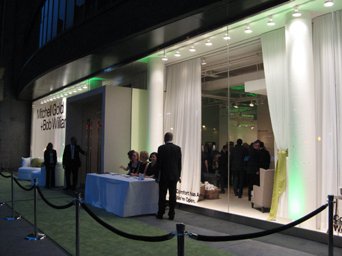 I guess I wasn’t really sure what to expect of what essentially amounted to an after-work ribbon cutting. Certainly not a velvet rope, swirling floodlights, a green carpet (it’s the new black! Er… red!), four women working the check-in table and black-blazered door security.