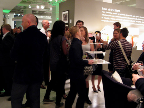 A long bar was set up along the back wall of the ground level space as a team of black-clad servers circulated through the crowd with multi-tiered trays of hors d’œuvres: mini-burgers – always a crowd pleaser – papers cones of pommes frites, vegetable dumplings, mini-lobster rolls… Most striking of all – aside from the novelty of a full blown party inside a furniture showroom – was the sheer beauty on display. Not only the furnishings — 12,000 square feet on 2 floors — but the attendees, men and women! (And I don’t think it was just the champagne goggles.)