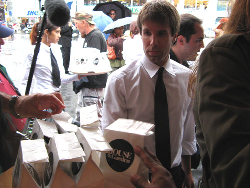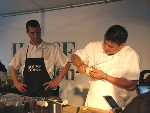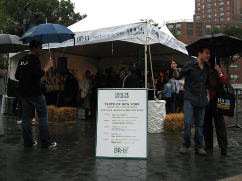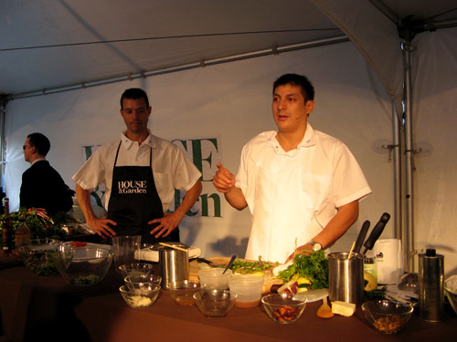 Today in Union Square, House & Garden was hosting free chef demonstrations as part of their week of “Design Happening” events. (Curious timing: two and a half weeks later, the magazine announced they would cease publication in December 2007.) The website touted a promising midday lineup of neighborhood chefs: Liza Queen of The Queen’s Hideaway, Jonathan White of Bobolink Dairy and Bakeyard, Michael Anthony of Gramercy Tavern, Josh Dechellis of BarFry, and Jason Avery of Pera Mediterranean Brasserie.