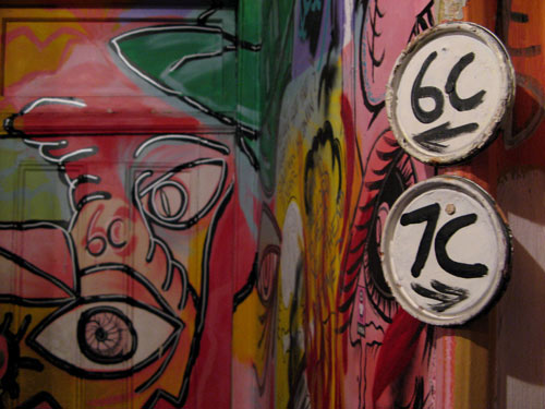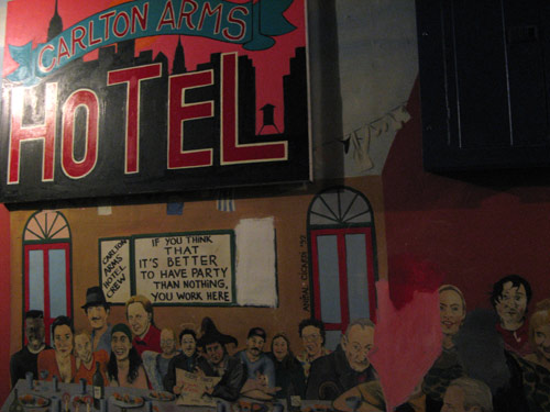 Ye Olde Carlton Arms Hotel on East 25th Street near Third Avenue started as an art project among a group of creative people in the 1980s. The then-new manager Ed Ryan had taken over the former flophouse and hired several of his artist friends to work the front desk; over time, they each began adding their own personal touches to the hotel walls and rooms, and eventually, the idea was born to transform the entire hotel. Dozens of artists from all over the world came to contribute. After Ryan retired in 1998, John Ogren and Ty Inwood took over the Carlton Arms and kept the art project and the budget hotel going. (Room start at $80/night for a single with shared bath.) Today, almost every square inch of the 19th century building interior has been painted or decorated by artists that came from all over the world: all of the 54 rooms, hallways, bathrooms and staircases.