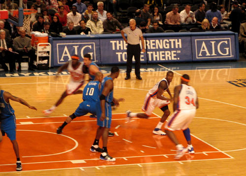 A spontaneous afternoon offer from SC, and we found ourselves at the Knicks-Magic game at Madison Square Garden this chilly, rainy night. The Knicks may be the most valuable basketball franchise in the United States, valued at approximately $592 million, but after six straight losing seasons and an off-season plagued by scandal, all around expectations are low and their fan support has eroded steadily. Even the local press has gotten in on the bashing, reporting on the team’s embarrassments with seeming relish (though it seems they have their reasons.)