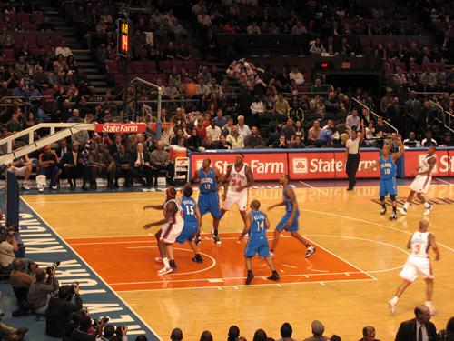 I hadn’t really followed the team since Patrick Ewing was traded to Seattle after the 1999–2000 season. The former center, who has been an assistant with the Magic since June, was at the game tonight; before the jumbo screens late in the game, Ewing rose to standing cheers in the arena that displays his retired #33 Knicks jersey. (Also in attendance: Carlos Beltrán who, by contrast, was booed.) The most recent team-related story I’d read had nothing to do with basketball at all, but with the immensely popular $15 sneakers in Stephon Marbury’s Starbury Collection at bargain sportswear chain Steve & Barry’s (which also sells Sarah Jessica Parker’s Bitten and Venus Williams’s EleVen budget fashion lines.)