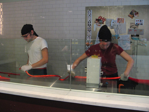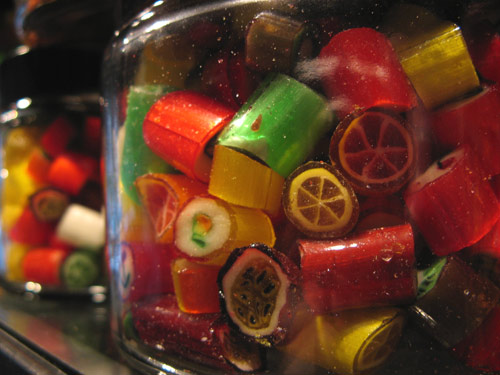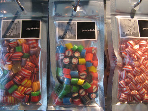 Papabubble was empty this afternoon but for us and three employees: one cashier, and two candy makers who were hard at work, pulling and shaping large, malleable blocks of sugar. As the pair moved quickly in tandem to run the candy through the extruder, the woman looked up from her work. No doubt sensing our fascination through the plexiglass barrier, she asked if we’d like to sample some fresh candy. Would we?! She obligingly cut off a couple pieces from the end with a pair of scissors, and I popped the warm, chewy, cherry-flavored piece into my mouth. Holy moly, what do they put in these things… crack cocaine?