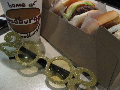 En route to the party, we made a stop at a surprisingly crowded Goodburger for — what else? — burgers. Make that a turkey burger for me, as I’d already exceeded my beef quota for the week. With the works, minus mayo: pickles, lettuce, tomato, onion, ketchup and mustard. Really good, but for me, Westville‘s version still tops my list, and not just for hot dates.