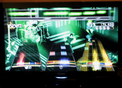 Play well enough and the “crowd” gets into the act by singing and clapping along, as in an actual concert. Play badly, and the song will be cut short. There are ways to drive up the cumulative score (with bonuses and multipliers for consecutive correct beats/notes/phrases, or by playing in unison), but I was concentrating too hard on just getting through my sections, which was both frustrating and exhilarating at the same time.