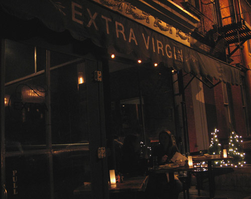 Three years later, the restaurant still draws crowds every night, and knowing its reservations policy — none for parties smaller than 6 — we planned an early arrival, and managed to score one of the tightly packed wooden tables with hardly a wait. It was a case of good timing: by the time our food arrived, the dinner rush had set in, with patrons packing the long bar area and spilling onto West 4th Street. Extra Virgin offers the option of a few sidewalk tables: highly coveted in warmer months, but seemingly utilized even on chilly evenings like this one, by the intrepid (or impatient) few.