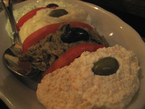 My favorite part of the meal — aside from the company, of course — was the “Four Combo Dip” platter: scoops of tzatziki (yogurt, cucumber and garlic dip), scordalia (potato and garlic dip), melitzanosalata (eggplant dip) and tarama (a fluffy, tangy fish roe dip), served with wedges of warm, grilled pita. I’d come back just for this.