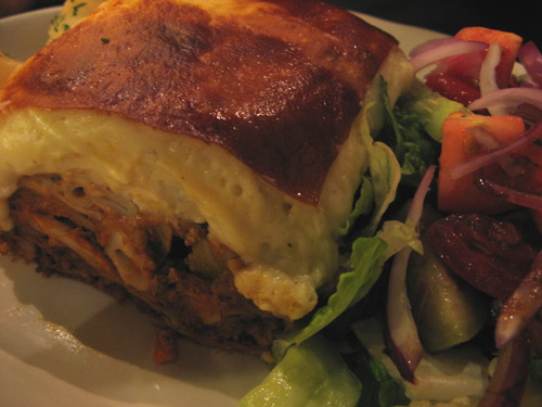 Pastitsio (oven-baked macaroni, spiced chopped sirloin, and whipped potatoes, layered with Béchamel sauce) — like a Greek lasagna, or Shepherd’s pie.