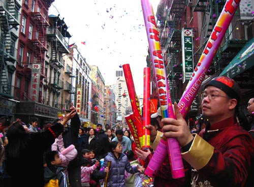 We had plans to check out the new year’s festivities going on in Chinatown this afternoon. I could hear the building din on my approach from the subway on Canal. Here, the madness on Mott. Drums! Lions! Second time in a week I was showered in confetti.