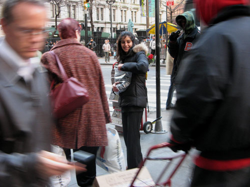 To coincide with Valentines Day, street teams dispatched by the Department of Health were handing out free NYC condoms at hubs around the city. I met this cheerful volunteer at Wall Street and Broadway, where she had no difficulty whatsoever finding takers for her ample supply.