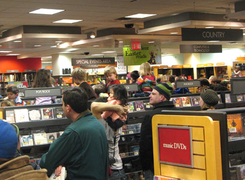 Very well known, in the former case, if this afternoon’s crowds were any indication. It seemed that the entire stroller brigade population of the Upper West Side had convened on the bookstore at Columbus Circle, where dozens of toddlers were propped up on adult shoulders, their little faces peering above the stacks like rows of prairie dogs.