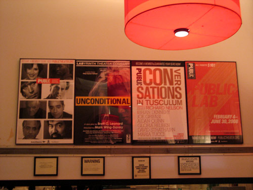 At the Public Theater tonight for Unconditional, a new production by Philip Seymour Hoffman and John Ortiz’s LAByrinth Theater Company. The play, written by Brett C. Leonard and directed by 1992’s OBIE Award winner Mark Wing-Davey, is a study in racial tensions and urban isolation, played out in the overlapping stories of nine New Yorkers. Any synopsis of the complicated relationships would best be conveyed by diagram; the play’s natural comparison would be to the 2004 film Crash… another entry in the “everyone hates everyone else” genre. In Unconditional, though, the tensions are mostly confined to between blacks and whites, with one fiery Latina thrown into the mix — probably the most entertaining of the miserable bunch.