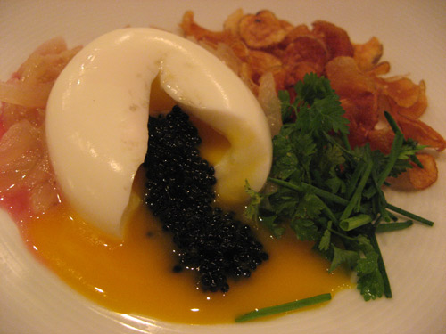 Smoked coddled “hen egg” with Hackleback caviar, onion soubise, sweet potato vinegar, fingerling potato chips and fines herbes: