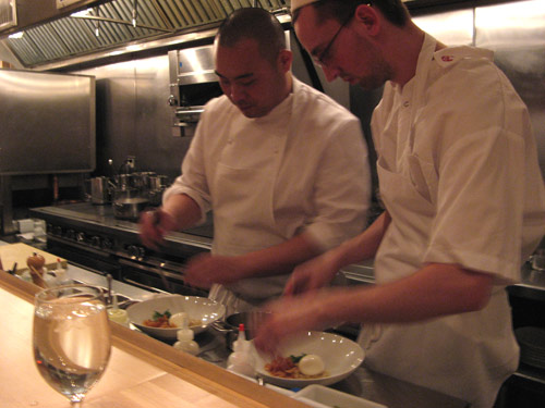 Just returned from the tasting menu at Momofuku Ko — easily the most transcendent meal I’ve had in recent memory. After a couple weeks of obsessively monitoring the reservations website, where new spaces at the 12-seat counter go up 7 days in advance promptly at 10AM, I managed to snare a reservation for 2 at 7:30PM tonight. (Not even Bruni is exempt from the scrambling madness.) And just as critics Ruth Reichl and Ed Levine, bloggers like Kathryn Yu and Tina Wong (a.k.a. The Wandering Eater) and several other members of the food community have said it would be, it was divine.