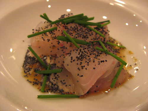 Fluke sashimi with spicy buttermilk sauce, poppy seeds and chives: