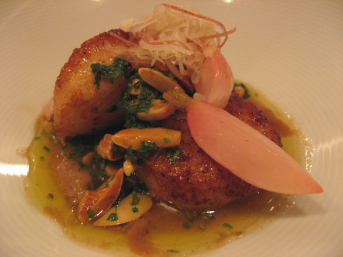 Seared scallops, with almonds, pickled radish and bacon puree: