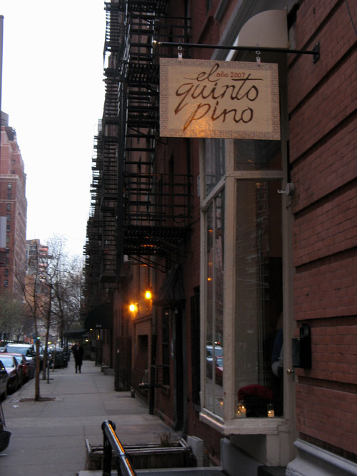 El Quinto Pino — the follow-up effort from the team behind successful tapas bar Tía Pol — has collected raves from just about every media outlet in the city since it opened last year. So it was with great anticipation that I made arrangements to meet MLF at 24th and Ninth this evening. When we arrived, the high-ceilinged room was packed with an after-work crowd, but almost right away, we managed to snap up a pair of seats near the front door. It was a stroke of good fortune: there are stools set up along the curved white marble-topped bar (behind which is tucked the diminutive kitchen) and several more scattered around the shallow-shelved perimeter, but otherwise EQP is standing room only. The food and drink offerings are as heavily edited as the decor: the entire handwritten menu fit on two chalkboards displayed above the bar.