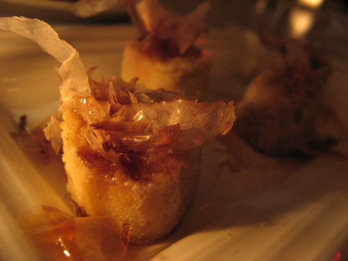 There was a dish of fine olives, and this intriguingly tasty Berenjena con Miel: pillowy cylinders of deep-fried eggplant, drizzled with honey and topped with bonito flakes.