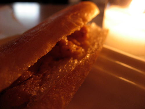 Hard to disagree with the first charge — The Times‘s Frank Bruni called it “the sandwich of [his] life” in his 2007 year-end review; food blogger Andrea Strong likened it to “really good, hot, sweaty sex” — and upon analysis, this delicate sliver of a sandwich does seem fairly simple and easily replicated at home: scallops of bright orange uni gently pressed into a slightly crisped ficelle from LIC’s Tom Cat Bakery, that’s been smeared with a kicky Korean mustard oil-spiked butter. Not hearty eats, by any means, but the synergy of briny, delicately sweet, custard-like roe (actually: gonads) and warm crunchy-chewy bread seemed to me the pinnacle of deliciousness. I’ve eaten more — if not necessarily better — for less money, and I’ve eaten worse for more money. Not as often, though, have I eaten less for more money. But is what averages out to about $2.50 a bite really so extravagant? (Sushi, after all, is in this price range… and often more.) I didn’t think so when considering my single $15 panini, though $30 for two panini (or $45 for three… which I could have eaten, happily) might seem to approach exorbitant levels for a place with no true tables. Personally, I didn’t mind, and was happy to wile away the hour and a half, savoring the bites, the good wine and the company of my friend.