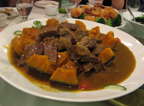 A dozen friends, new and old, gathered in the restaurant’s lower level. Early in, it was established that we would place ourselves (willingly, happily) in SL’s capable ordering hands, and just eat whatever food was placed before us this evening. So began the parade of deliciousness — off and on the menu. A platter of batter-fried seafood, sauteed pea shoots, pan-fried noodles with seafood, braised E-Fu noodles with black mushroom (for longevity), and this, the first of two restaurant specialties that required advance ordering: Short Rib Beef in a Pumpkin. Yes: that’s short rib beef! In a pumpkin! Was ever there more a delightful combination of words spoken? The dish was brought out to the table in one glorious piece, with chunks of steaming, lightly curry-spiced meat exploding tantalizingly out the top of the hollowed out squash. Our glossy-tressed waiter, brandishing a large chef’s knife, made quick work of the soft, pumpkin flesh before our eyes.