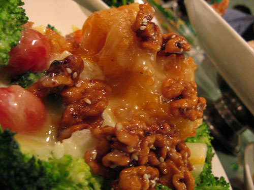 Salad Walnut Prawns — a classic dish made up of the seemingly strange combination of deep-fried jumbo prawns, slathered in a sweet mayonnaise, and laid over a bed of dressed mixed fruits, broccoli and candied walnuts. Tasty, though.