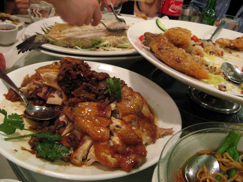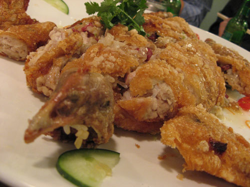 And the second show-stopper of the evening: the House Special Crispy Chicken Stuffed with Sticky Rice. Essentially, a whole chicken, deboned and de-…fleshed(?), crammed with a combination of sausage-studded sticky rice, and then deep-fried and meticulously reassembled into the general shape a chicken, albeit a rather flat one. Head included, of course — to symbolize wholeness and togetherness.
