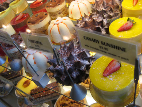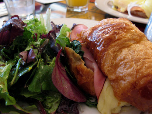 LC suggested Saint Germain, a très French bistro on Third Avenue, which had received some good word of mouth from the locals. The location has been home to a series of French bistros, beginning in 1999 with Le ZaZou, to Provence en Boite (which relocated to Smith Street in Carroll Gardens) before hitting upon its current incarnation. The cozy restaurant is a popular brunch spot — no wonder: the prix fixe is an excellent value, offering choice of entrée, coffee or tea, plus orange juice or Lorina sparkling pink lemonade, and a fancy dessert, all for $16.95. Our party of four waited about twenty minutes for a table, which gave us plenty of time to consider the myriad pastry options in the glass display case up front, and to ponder what exactly goes into Saint Germain’s specialty “Brigitte Bardot” cocktail. (Answer: lemon vodka, triple sec, and that sparkling pink lemonade. What, no St-Germain?)