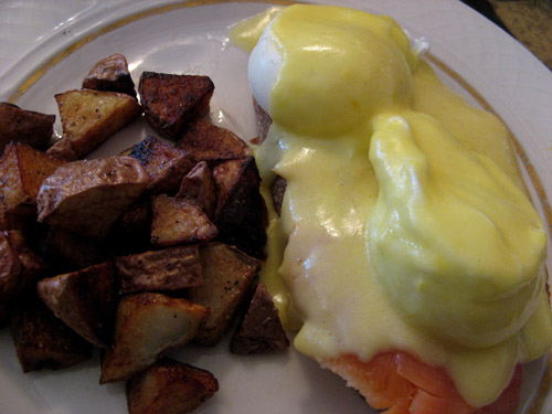 For better or worse, our experience felt truly Parisian: beyond leisurely, the service ranged from benignly neglectful to maddeningly slow. After making our selections from the brunch menu (the usual egg dishes, croque monsieur, crêpes, French toast, croissanwiches), we waited another twenty minutes for someone to take our order. The entrées, when they came, were quite good, though I would have enjoyed my Smoked Salmon Eggs Benedict more with the cup of coffee I ordered… which did not come despite two requests. (Each time we asked for our drinks, the waitress would cheerily respond, “Sure!” and continue merrily along, unfazed.)