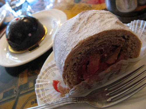 When at last we got our coffees and teas with dessert (pictured below, my apple pastry and HH’s chocolate mousse dome), they came poured into too-hot-to-handle glass tumblers. No explanation or apology given, but we deduced that the kitchen must have run out of their usual white cups, though I noticed about half a dozen used ones sitting on yet-to-be-cleared tables around us.