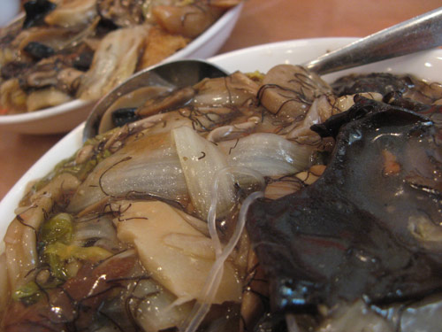 This slow-braised dish usually consists of a fairly long list of ingredients, cooked in a soy sauce-based liquid with other seasonings until tender. The specific items used vary greatly both in and outside Asia, and often carry some auspicious significance: black moss (fat choy) is a homonym for prosperity (as in “Gung Hay Fat Choy“); ginkgo biloba nuts (bak ko) mimic silver ingots and therefore also bring good fortune; fried tofu and beancurd sticks (foo jook) represent blessings to the house; bamboo piths (jook tseng), wood ear fungus (ha mok yi) and mung-bean threads (fun see) symbolize long life.