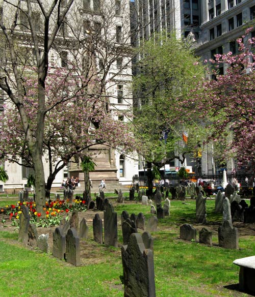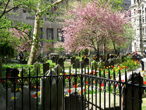 Manhattan has its blooms, too, which though not as abundant, are still beautiful. On warm spring days like today, the financial district drones emerge from out under the fluorescent lights to steal a few moments in the sun among the weathered headstones in the Trinity Church graveyard.