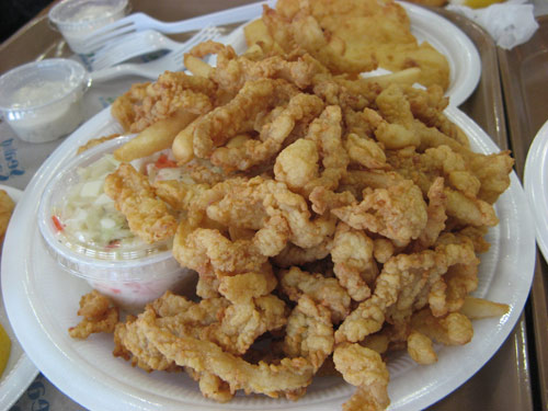 We couldn’t bid adieu to the Cape without at least one more visit. Locals and visitors have been flocking to this place for some of the best fried seafood in the area since 1974, when the first Seafood Sam’s opened in a tiny, former laundromat with just six employees. Three decades later, three of those original six now own and operate the mini-chain of Sam’s restaurants. In the years since we’ve been going, we’ve seen the Yarmouth location evolve from a glorified shack with several open-air benches to a full casual-dining restaurant. There’s still no table service, but the airy main seating area is now enclosed within solid walls (vs. the former combination of sturdy canvas and clear plastic) and the bathroom was moved from outside and around the corner, to just down the hall from the dining room. What hasn’t changed: food orders are still placed with the cashier, and arrive piping hot on disposable plates; the faux-wooden trays are scattered with clear plastic cups of tartar sauce and wedges of lemon.
