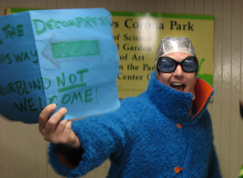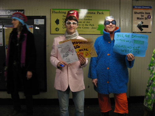Turns out that they were members of The NYC Decom Team, promoting NYC Decompression 2007 — the city’s official Burning Man offshoot. Like that annual eight-day long art event that draws tens of thousands to a remote lake bed in the Nevada desert, the Decompression Party was intended to draw creative-types to Flushing Meadows Corona Park–a place so chosen (according to the downloadable survival guide) as “like the Black Rock Desert… a location that may deter the casually curious but pique the interest of [the] genuinely committed.”