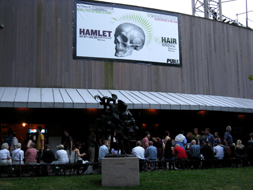 Our summer tradition: The Public Theater’s Shakespeare in the Park productions. In 2007, we enjoyed Romeo and Juliet and A Midsummer Night’s Dream. This year brings Hamlet and Hair… and a change to the ticket distribution system. Reserving a seat to these free productions used to involve camping out — sometimes overnight — on the line in front of the Delacorte or Public Theaters for the 1PM ticket distribution, or making a “summer supporter” donation to the Public Theater. This summer, for the first time, the theater also offered guests the option of joining a “virtual line” — actually, more a lottery — by registering at the Public Theater reservations website and submitting requests for up to two tickets on each performance day.
