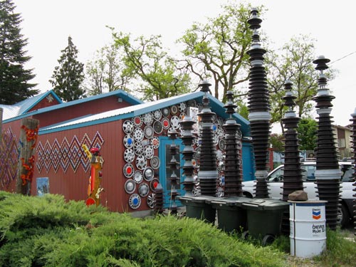 This densely decorated two-story red wood frame house, known as Dick and Jane’s Spot, is the project of local artists Dick Elliott and Jane Orleman, who have dedicated their home and yard to showcasing their own and the work of dozens of other artists.
