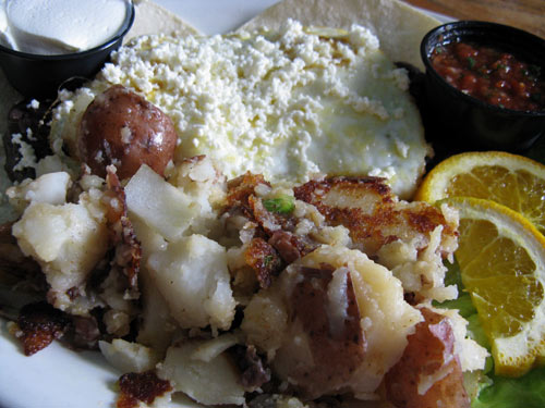 From among the mouth-watering list of “Praiseworthy Breakfasts,” I ordered the “Huevos Rancheros” — minus the cheddar — seen here. (“St. Benedict‘s Eggs” and “Pagan Pancakes” were also options.)