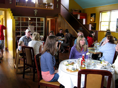 Ellensburg’s raison d’etre is Central Washington University. MT observed that the streets were very similar to those of Ithaca… down to the signature area gorges. Our plan this morning was to visit the Yellow Church Café on South Pearl Street – a converted 1923 German Lutheran church popular among the locals for its [secular] weekend brunch. We arrived, however, to find a small crowd already gathered in the foyer: though classes were out for the semester, the otherwise sleepy college town was descended upon by Sasquatch visitors, and our party of five was advised of a half hour wait for a table. Just in case we were nostalgic for home.