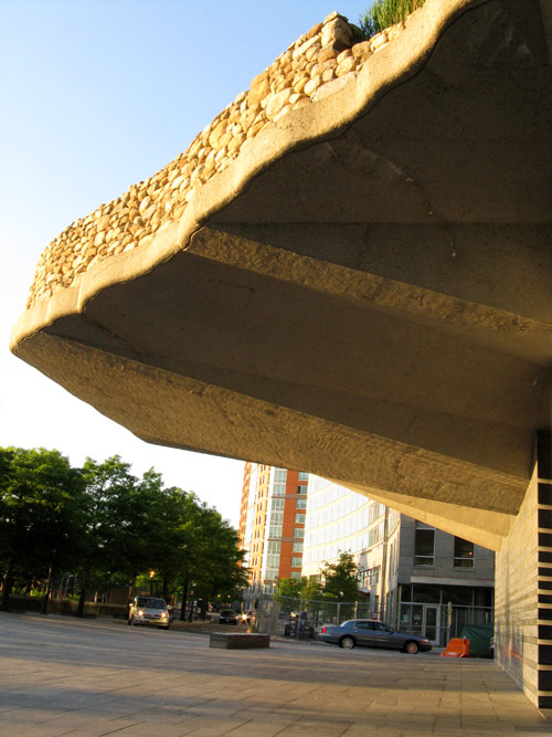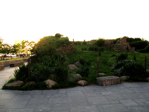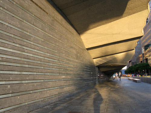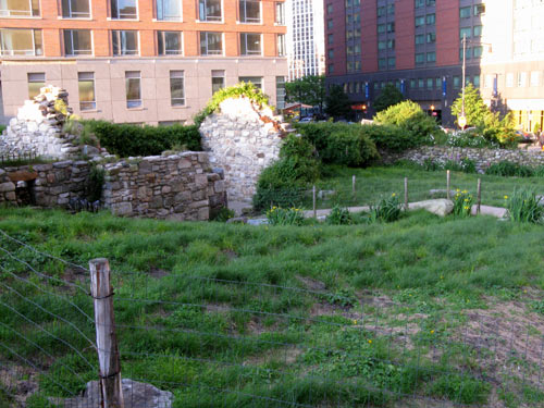 On my way to the outdoor music recital, I walked by the Irish Hunger Memorial — a striking 1/4 acre plot of land nestled anachronistically among the lower Manhattan skyscrapers, jutting out from the sidewalk at Vesey Street and North End Avenue. The memorial was designed collaboratively by artist Brian Tolle, in association with 1100 Architect and landscape architect Gail Wittwer-Laird. (Factsheet .pdf) Theirs was the winning entry in a 2000 design competition for the site, which was donated by the Battery Park City Authority.