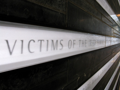 The exterior wall of the memorial and its interior passageway are lined with almost two miles of text, etched onto illuminated glass and Plexiglas panels: excerpts of bills, notes, letters, statements, songs and reports, recipes, quotations, proverbs and statistics, intended to provoke debate or inspire reflection. The memorial’s 1/4-acre lot represents the maximum-sized plot one could own to still be eligible for any form of government relief under the infamous Gregory Clause that was added to the Poor Law of 1847 — a British land policy which effectively cleared estates for landlords and exacerbated the famine by destroying a way of life for an entire class of small farm laborers in Ireland. Thousands died of starvation rather than relinquish what little they still had.