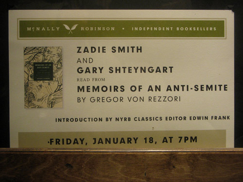 At McNally Robinson bookstore in NoLIta for a reading and discussion of Romanian–born writer Gregor von Rezzori‘s recently reissued novel, Memoirs of an Anti-Semite — five connected stories, taking place over several decades, exploring the European aristocrat protagonist’s relationship with and ambivalent attitudes toward Jews.