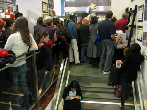 I arrived shortly after the author introductions, and this was the closest I could manage to the stage, and green sweater-clad Smith. Well, it’s a reading, not a sighting.