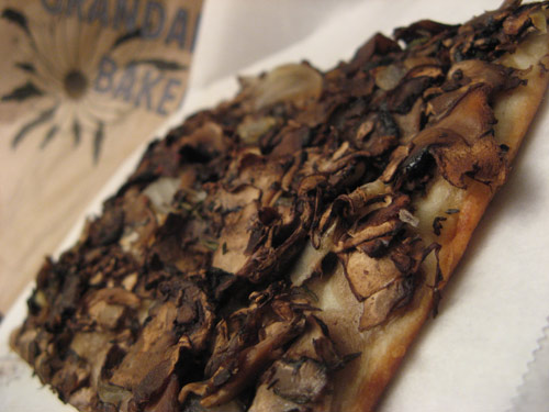 This afternoon, Grandaisy had four varieties of pizza – identical to the ones available at Sullivan Street Bakery: their pomodoro (tomato sauce, olive oil and sea salt), cavolfiore (cauliflower, Gruyère cheese, bread crumbs, olive oil and black pepper), patate (potato, onion, olive oil, rosemary and black pepper) and funghi (cremini mushrooms, onions, olive oil, sea salt and thyme). Not offered today: the zucchini and the pizza bianca, hand-formed slices of flatbread, dressed simply with extra virgin olive oil, coarse sea salt and rosemary.