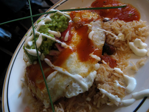 The Huevos Rancheros — one fried corn tortilla, Spanish-style rice, homemade frijoles negros, and a true chili ranchero sauce topped with two fried eggs and garnished with authentic Mexican crema, guacamole, pico de gallo and limes. I almost didn’t finish this entire platter. Almost. (Well, I had a little help.)