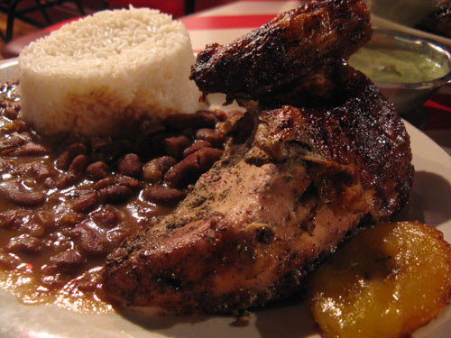 The plate of quarter-chicken with white rice and red beans was a terrific value at under $5: all crisp skin and tender, moist meat, chunks of which we dipped greedily into the irresistibly creamy, spicy house ají sauce. (Bonus plátano maduro courtesy of B’s plate.)
