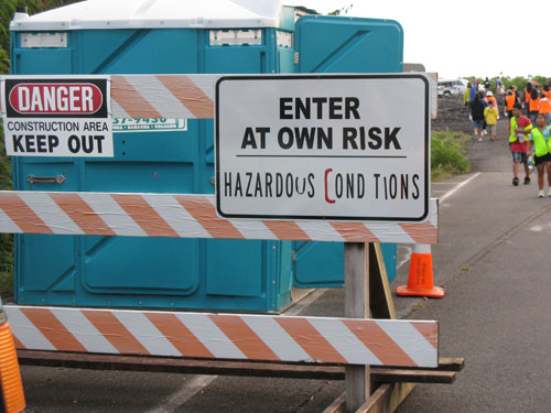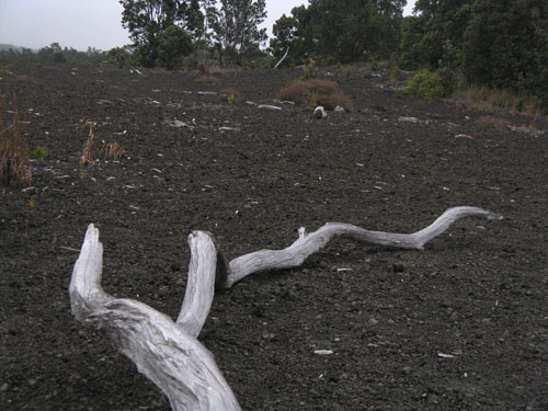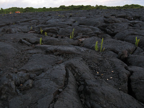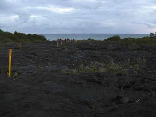 Setting foot on this newly formed, perhaps not entirely stable, land is a disconcerting experience: 23 acres of land fell into the ocean last May; over several hours in November 2005, 44 acres of coastline disappeared in segments — the largest collapse since Kīlauea Volcano began its current eruption, and a collapse which included a park station and a segment of the original road out to the lava flow lookout point.