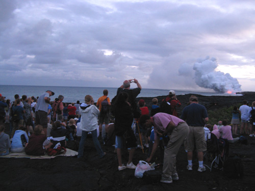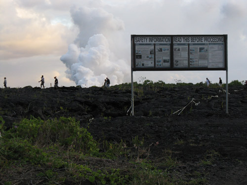 The spectacle of red molten lava hitting the water in blooming clouds of steam draws crowds every night. As the park rangers (and many signs) are quick to warn, trekking out to the view point is something done at your own risk.