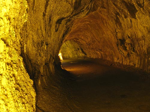 Thurston Lava Tube — an approximately 500 year old cave-like channel formed when slow-moving lava developed a hardened upper crust, forming a roof above the still-flowing lava stream. This segment of the tube is lit (another 1000 feet — open to the public, but blocked off by a chain link gate — is not), with ferns the only vegetation, sprouting up around the edges of the lights.